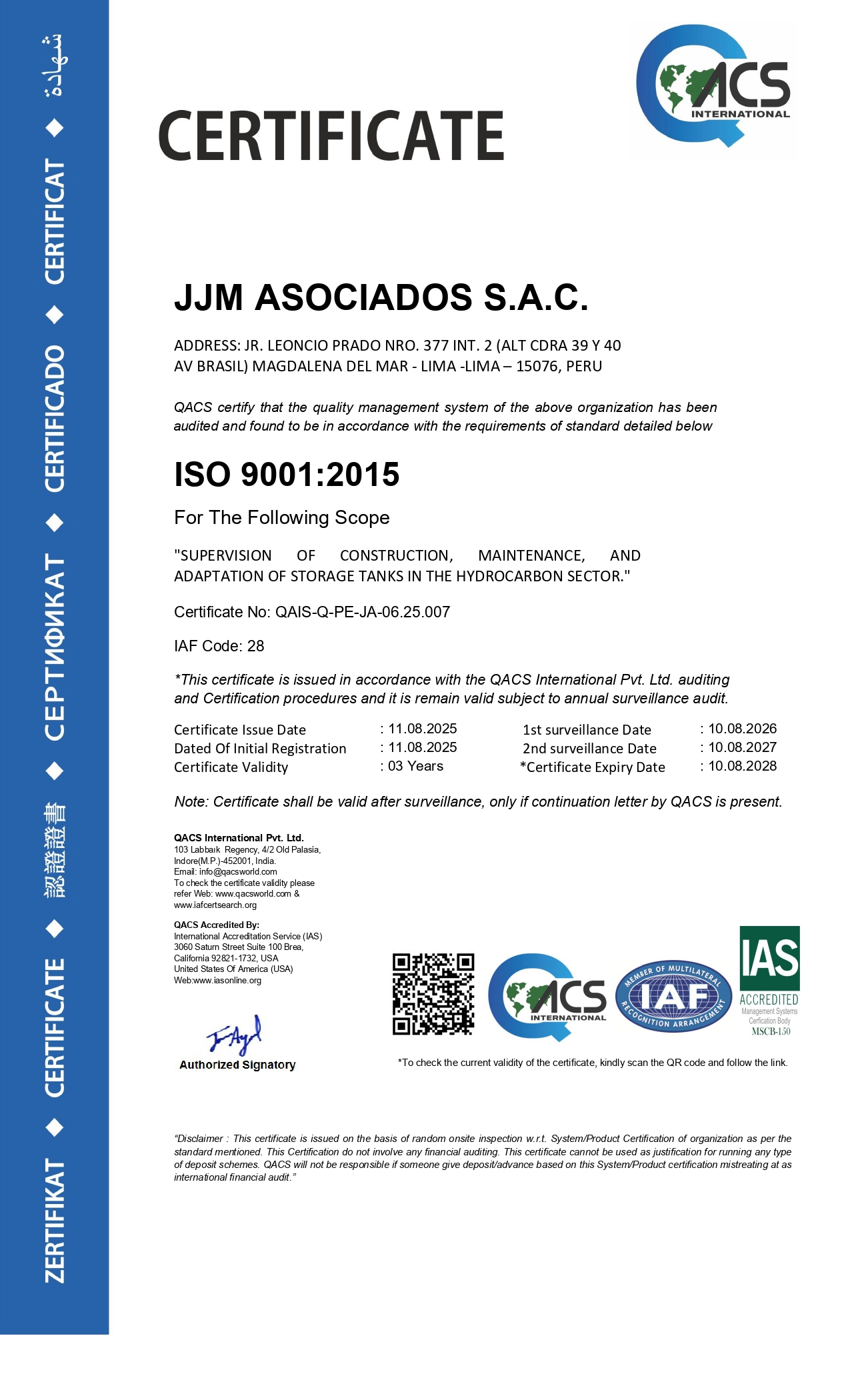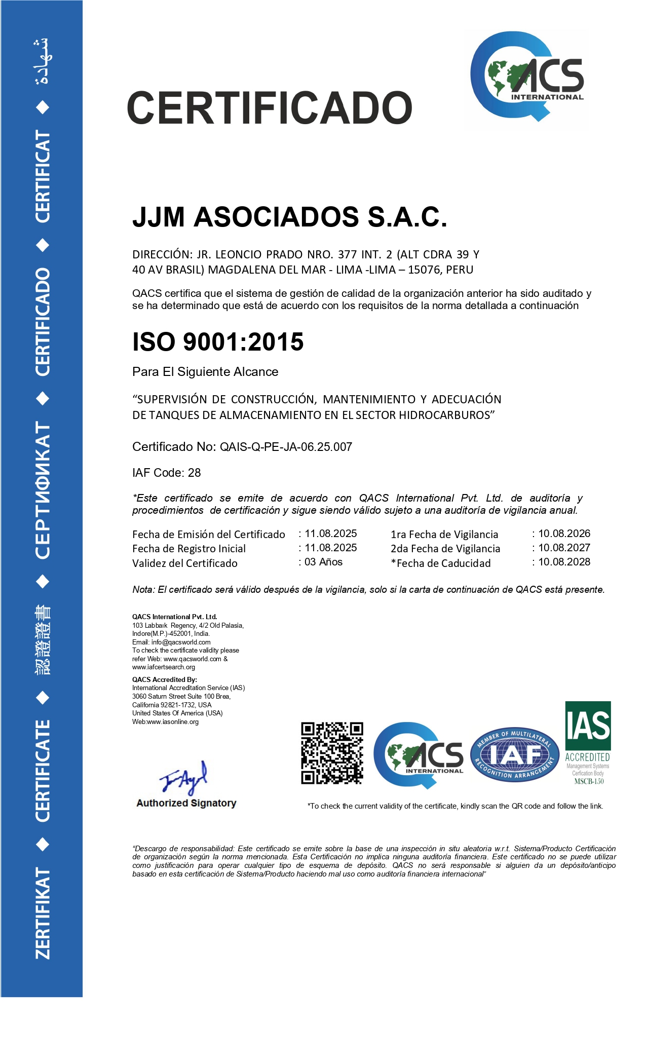Más de 36 años de experiencia laboral en construcción de puentes, oficinas, viviendas, pistas de asfalto, movimiento de tierras. Ex presidente del Capítulo de Ingeniería Civil en Talara. Durante su desempeño laboral con JJM ASOCIADOS desarrolla el cargo de Gerente de Proyectos en servicios de supervisión, inspección de diversos contratos de proyectos de mantenimiento y construcción de tanques de almacenamiento de hidrocarburos. Cuenta con conocimientos y capacitaciones de normas nacionales y internaciones en códigos ASME, API 653, 650, ANSI, NFPA, etc.